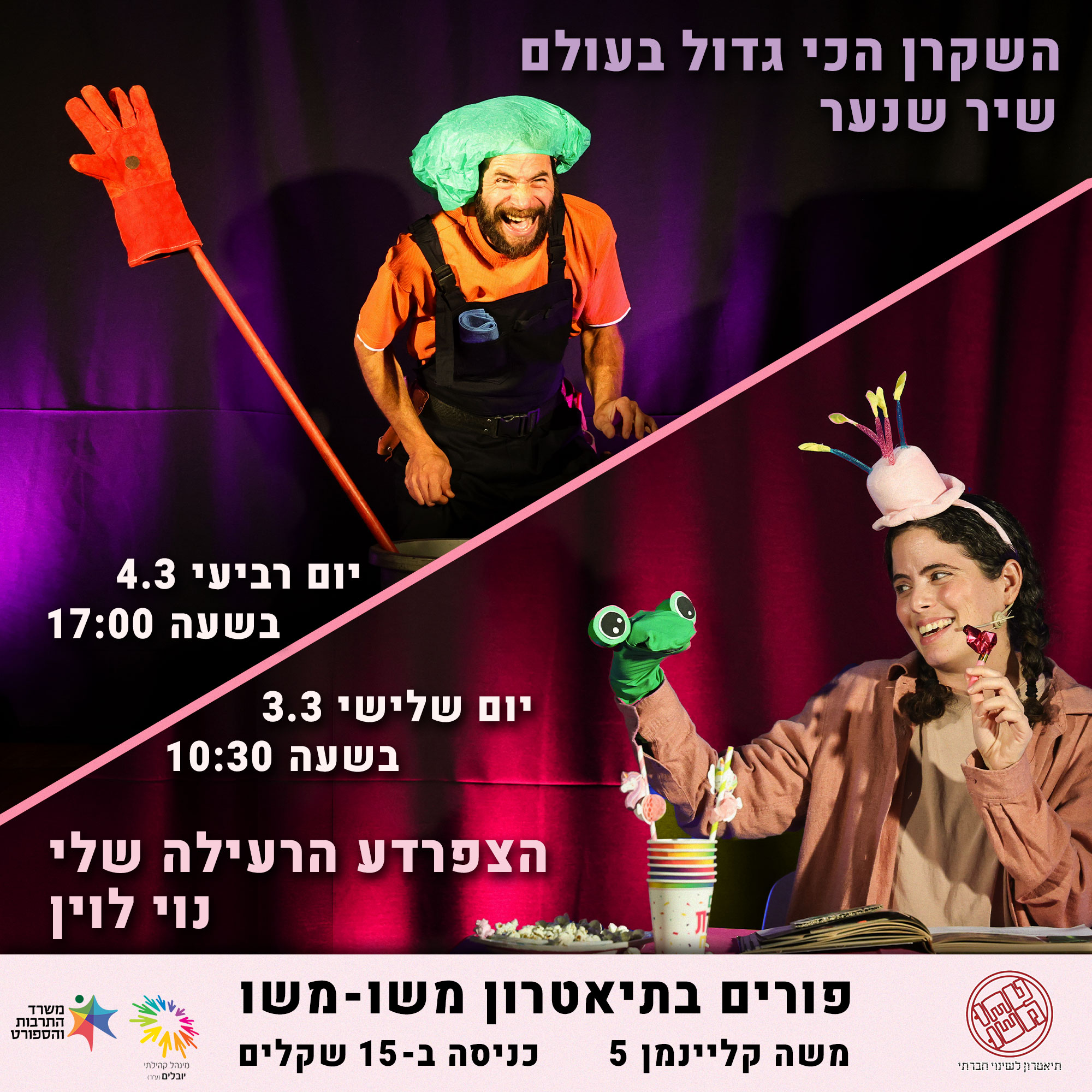 שתי שעות סיפור קסומות ומרתקות על ממלכות רחוקות ויצורים מופלאים. עם נוי לוין ושיר שנער והצגותיהן החדשות! מתאים לגילאים 3-6 יום שלישי 3.3 בשעה 10:30 הצפרדע הרעילה שלי שעת סיפור עם בובות, אביזרים והפעלת קהל על מתנת יום ההולדת המשונה ביותר. מאת ובביצוע של נוי לוין יום רביעי 4.3 בשעה 17:00 השקרן הכי גדול בעולם הצגת יחיד פרועה לילדים על מנקה אחד מספר את הסיפור הכי מטורלל שתשמעו בפורים הזה. מעת ובביצוע: שיר שנער.