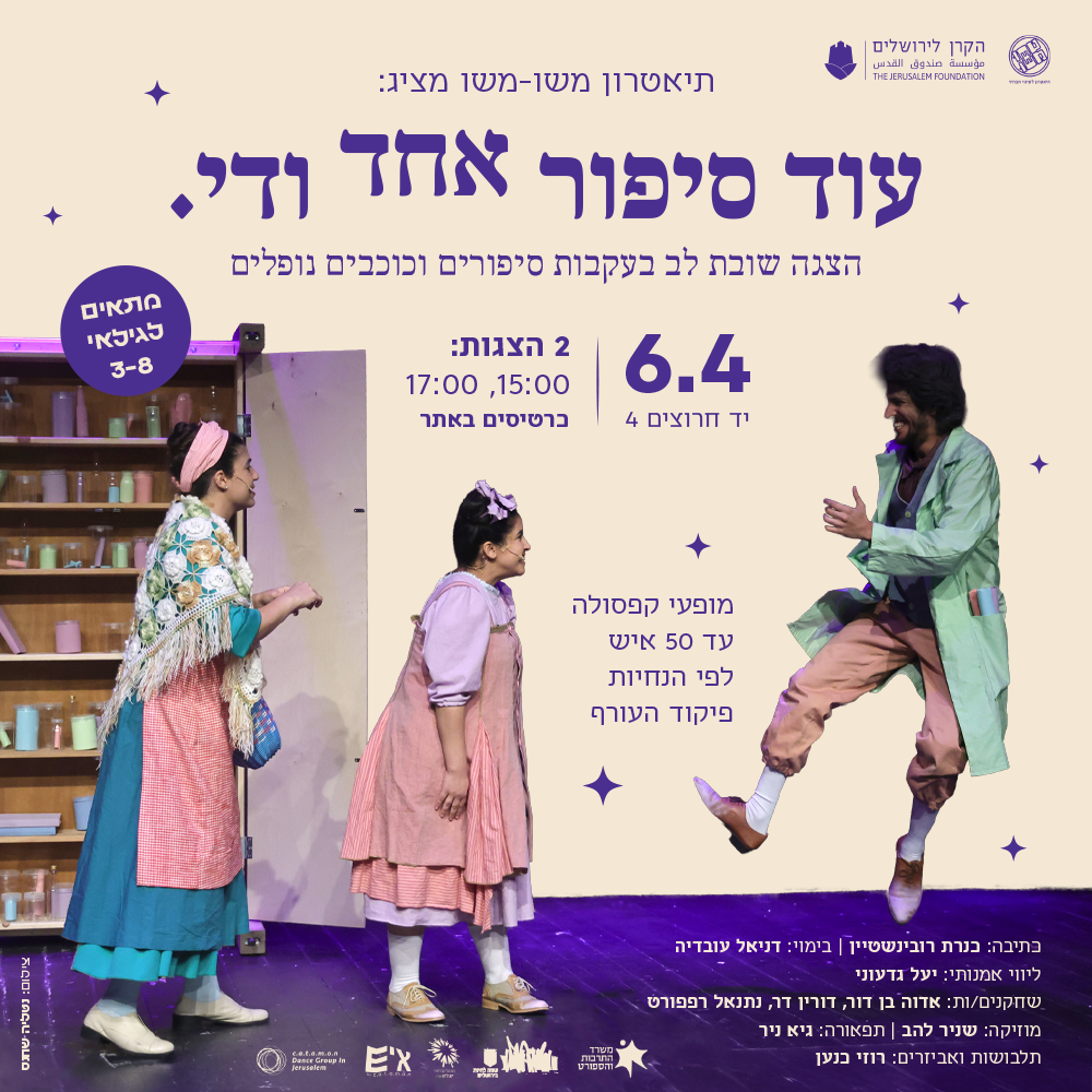 ״עוד סיפור אחד ודי״ הצגה שובת לב בעקבות סיפורים וכוכבים נופלים 6/4 יד חרוצים 4 2 הצגות בשעה 15:00 ו-17:00 מופעי קפסולה עד 50 איש לפי הנחיות פיקוד העורף יצירתן של כנרת רובינשטיין ודניאל עובדיה בכפר קטן, שבו לכל משפחה יש מקצוע משלה, יש משפחה אחת שמומחית בלספר סיפורים. כשאביגיל שוב לא מצליחה להירדם, אמא לוקחת אותה אל משפחת מספרי הסיפורים, ושם הן מקבלות סיפור מסתורי במיוחד: על כוכב שמסתתר בתיבה. אביגיל לא מסתפקת במילים – היא יוצאת לגלות: האם באמת יש כוכב בתיבה בחווה? מתאים לגילאי 3-8